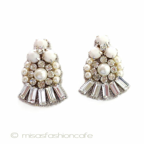 【 SPARKL jewelry - From USA 】 商品:ピアスまたはクリップ式イヤリング選択。 ブランド: SPARKL (スパークル) デザイン: パーティースタイル。 素材:オーストリア製クリスタル・ホワイトストーン・パール・Embroidery針刺繍・レザー(裏面)。 サイズ:縦3.2cm・横2.4cm。