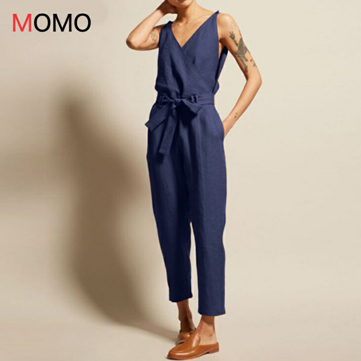 コットンリネン ノースリーブジャンプスーツ ハイウエストワイドレッグウエストパンツ オーバーオール 爽やかジャンプスーツ ナチュラル オールインワンサロペット 大人コーデ 大人カジュアル 韓国 レディース 普段着コーデ ナチュラルコーデ S〜XL