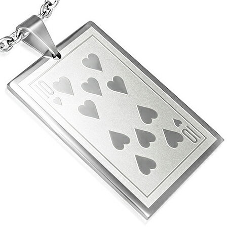 トランプのハートの10をデザインしたステンレスペンダント。素材にステンレスを使っているので傷つきにくく、アクティブに使ってもOK!その上医療用ステンレスなのでアレルギーも安心です。シルバー925に比べて、価格も手頃で、高級感を発揮できるステンレス製ペンダントトップはプレゼントにも最適です。ステンレストップのみで買えるので、ネックレスパーツとしてだけでなく、色々なステンレスパーツとして、自由自在にアレンジが楽しめるオシャレなステンレスアクセサリーです。永遠に変わらない素材ステンレスはペアアクセサリーにもオススメです。軽量かつ丈夫で変色することはほとんどなく、しかも、金属アレルギーがほとんどない事も特徴です。※チェーンは別売りです。 スペックこちらの太さより細いチェーンをご利用ください:約4.0mm大きさ:約22mmx40mmx2.0mm素材サージカルステンレス316L備考・表示は1個の価格です。・ハンドメイドの為多少サイズは異なります。