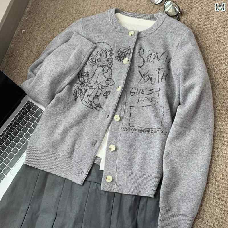 グレーニットカーディガン アメリカン カレッジ ニットカーディガン 女性用 秋 グラフィティ スリムフィット グレー アウター ショート セーター ジャケット