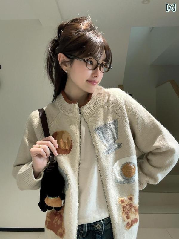 服 シンプル アメリカン カレッジ ニットカーディガン レディース 秋冬 ジッパー アウターウェア ジャカードセーター ジャケット ゆったり ハイエンド