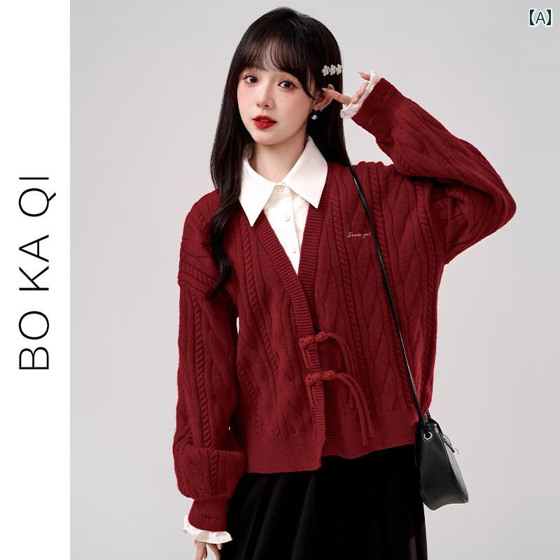 レディース ファッション 春秋 赤い フェイク ツーピース ツイスト セーター 女性 ガーリー カレッジ ニットカーディガン