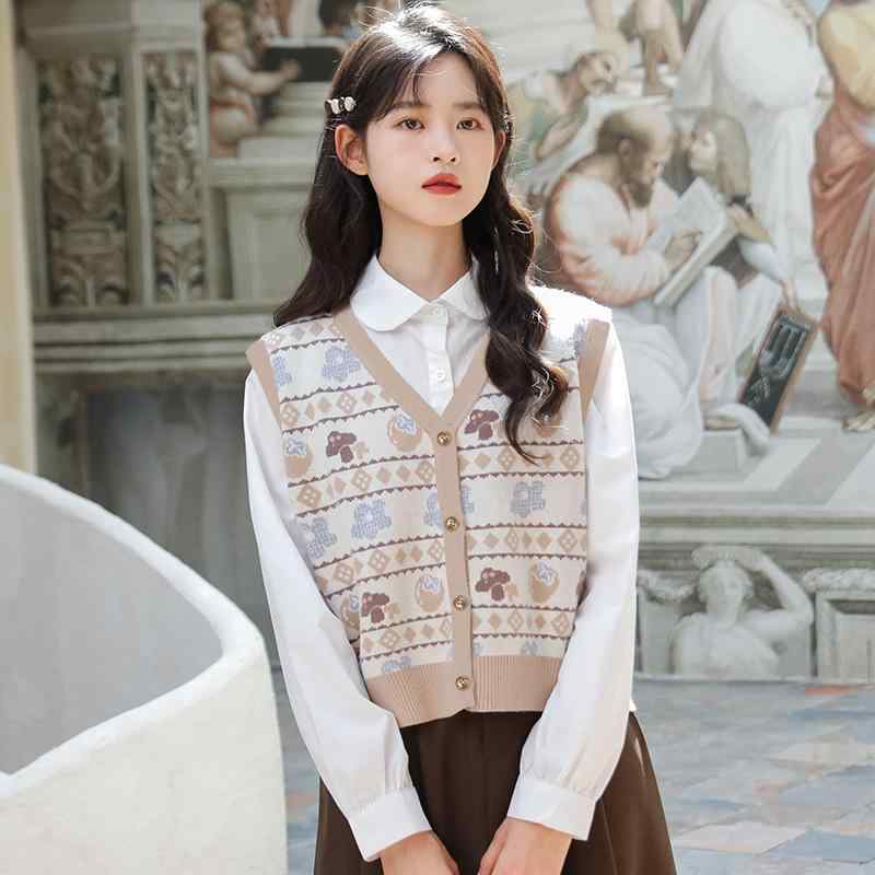 トップス レディース ファッション 春秋 Vネック 花柄 ベスト 女性 ガーリー カレッジ ニットカーディガン ベスト クリップ ショート