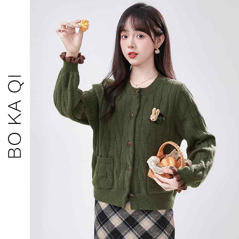 ジャケット レディース ファッション 秋冬 レトロ ラウンドネック ツイスト フォレストグリーン セーター 女性 ガーリー カレッジ ニットカーディガン