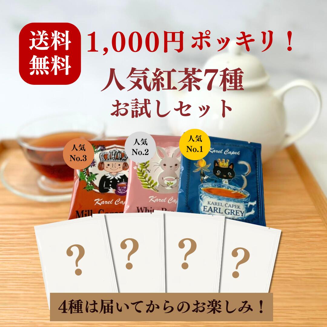 \だからこそ、この価格でお届けできる!/ 届くまでのお楽しみ!今だけのお楽しみティー付き! 人気ベスト3と スタッフおすすめの「今だけのお楽しみティー」4種のセット! 「今だけのお楽しみティー」には、 販売終了が近い商品や季節限定フレーバーなど、 現在オンラインでは販売していない紅茶も入っているかも!? もちろん、どれも味や品質には一切妥協なし。 賞味期限も十分余裕があるものだけを厳選していますので、安心してお楽しみいただけます。 ちょっと特別な7種セットを、送料無料&1000円ポッキリで! 初めての方に、紅茶のある暮らしを気軽に楽しんでいただけたら嬉しいです。 1. セット内容 ■人気紅茶ベスト3 アールグレイ×1 ミルクキャラメル×1 ホワイトピーチ×1 ■今だけのお楽しみティー 在庫限りのおすすめフレーバー:4枚 合計:ティーバッグ7種(個包装・タグ付き) 2.こだわりポイント 人気の味を飲み比べできる満足セット 「このセットだけ」のレアフレーバーも楽しめる! スリランカ産など、品質にこだわった茶葉を使用。 鮮度・香り・味わい、すべて妥協なし! 3.お届けについて 全国送料無料(ポスト投函) メール便でお届けします 受け取り不要&ご自宅ポストにそのままお届け! 4. 美味しい飲み方 【ホット】 カップにティーバッグを入れます 沸騰したお湯150mlを注ぎます 4分蒸らして完成。ミルクやレモンもOK! 【アイスティー】 沸騰したお湯100mlを注ぎます。 3分蒸らして抽出した茶液を氷たっぷりのグラスへ注ぎます。 氷が溶けてアイスティーに! 【水出し】 ティーバッグ1個+水200ml 冷蔵庫で4〜6時間抽出 すっきり香るアイスティーの完成! 5.ご注意ください 「お楽しみティー」は在庫に限りがある商品のため、同じ内容で再購入できない場合があります ギフト包装には対応しておりません(簡易包装でお届け) 内容は時期により一部変更される場合があります(品質に影響はありません) 名称 1000円紅茶お試し7種セット セット内容 ティーバッグ×7p フレーバー アールグレイ、ミルクキャラメル、ホワイトピーチ、その他ランダム 内容量 1.5g×10p 原材料 紅茶/香料 その他ランダムでルイボスやハーブあり 原料原産地 スリランカ、インド、その他ランダム 賞味期限 半年以上 保存方法 高温、多湿、直射日光を避けて保存 製造元 (メーカー) 株式会社カレルチャペック 東京都渋谷区千駄ヶ谷5-32-6グリーンスクエア新宿7F
