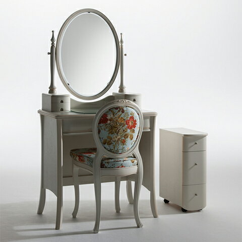 商品情報サイズ 本体 : W740.D420.H1440(720)mmチェスト : W200.D380.H560mm(キャスター仕様) 材質*天然突板ナラ*MDF(F-☆☆☆☆)*合板(F-☆☆☆☆)色アンティークホワイト 商品説明ドレッサー・アルバ。縦の楕円のミラーが優しい表情の中にエレガントさを。そのミラーを支えるクリ棒と4本の脚はクラシカルな雰囲気を。W,740とコンパクトサイズながらキャスター付きの収納ワゴンが本体足元の中に収まる設計になっておりデザイン性と実用性の2つの要素を兼ね備えているところが人気のポイント。注意書きモニターの発色具合によって実際のものと色が異なる場合があります。カンティーニュ ドレッサー アルバ 猫脚家具 白い家具 クラシック家具 ロココ調 ラグジュアリー エレガント メイク 松永工房 アンティーク 送料無料 一面鏡 ミラー 鏡 椅子付 松永工房カンティーニュシリーズのドレッサー本体、ワゴン、椅子付3点セット 11