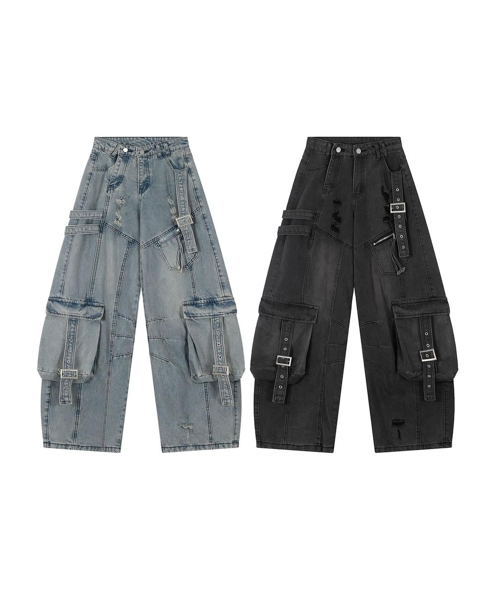 【2025NEW】 【HOOK】ストラップベルトカーゴデニムパンツ レディース ストリート風 大容量ポケット ベルト付きデザイン ヴィンテージ感 日常 おしゃれ
