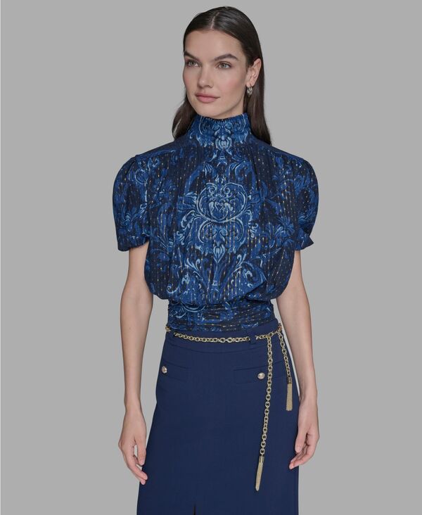 カール ラガーフェルド レディース トップス シャツ プリント パフスリーブ トール KARL LAGERFELD PARIS Women's Metallic Printed Puff-Sleeve Top Naval Academy メタリック