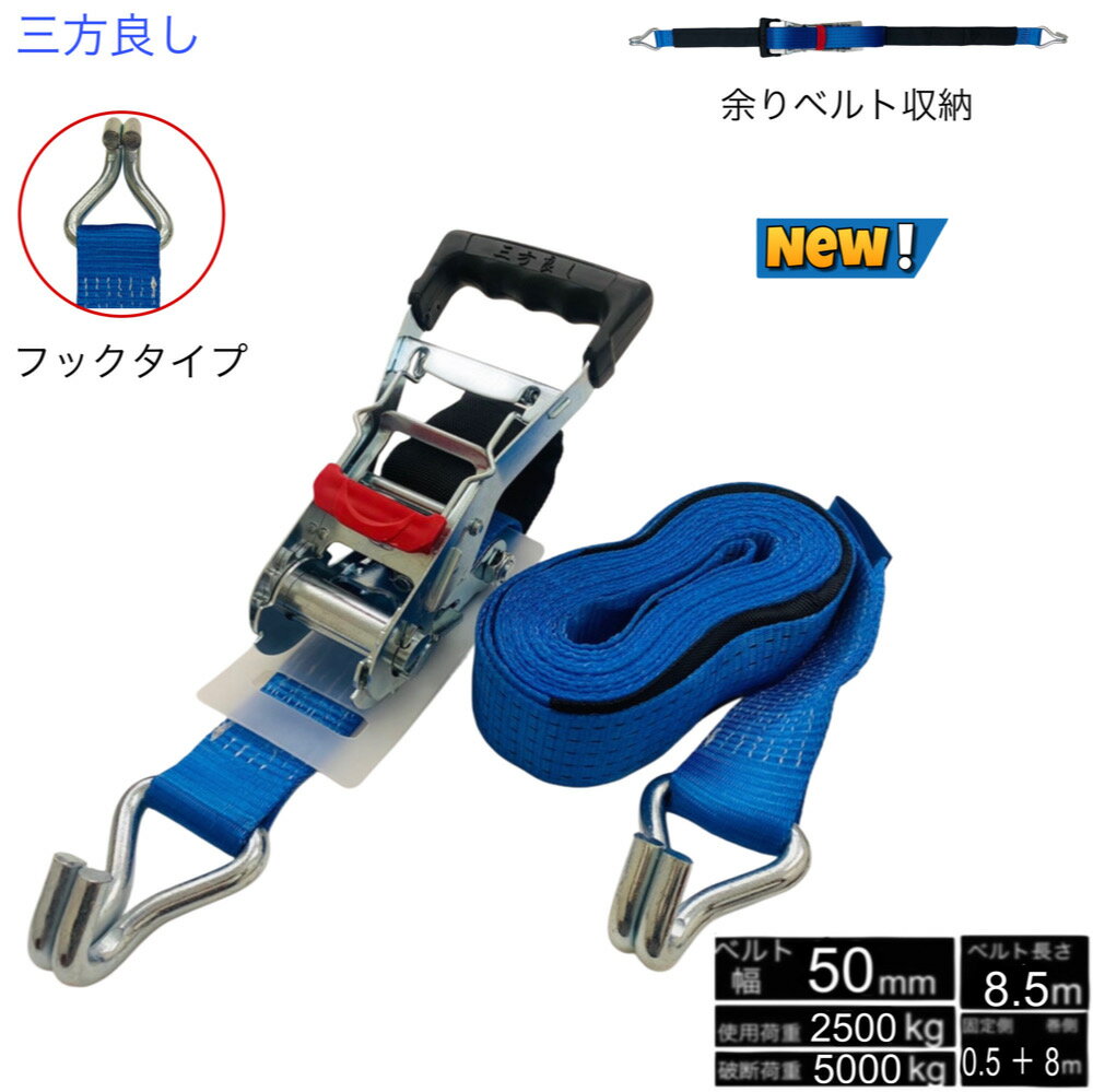 三方良し新タイプ ラッシングベルト フック 幅50mm 破断荷重5000kg 固定側 0.5m 巻側 8m 新タイプ荷締機ベルト収納式 ラッシングベルト 50mm幅 Jフック ブルー色 ラチェット式Jフック 荷締め 荷崩れ防止 車トランク用ベルト 運搬ベルト 固定ベルト タイダウンベルト ガッチャ