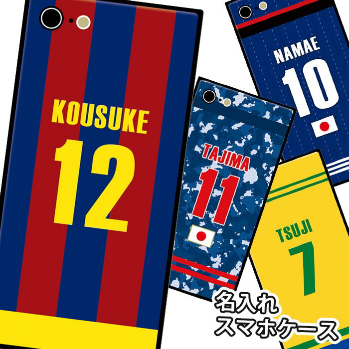 【楽天スーパーSALE 半額】スマホケース スクエア ガラス 名入れ ユニフォーム風 サッカー 日本 バルセロナ ブラジル ネーム 名前入れ iphone15 pro MAX iphone14 pro iphone13 iphone12 pro 四角 TPU ガラスケース 背面ガラス 強化ガラス TPU ハードケース