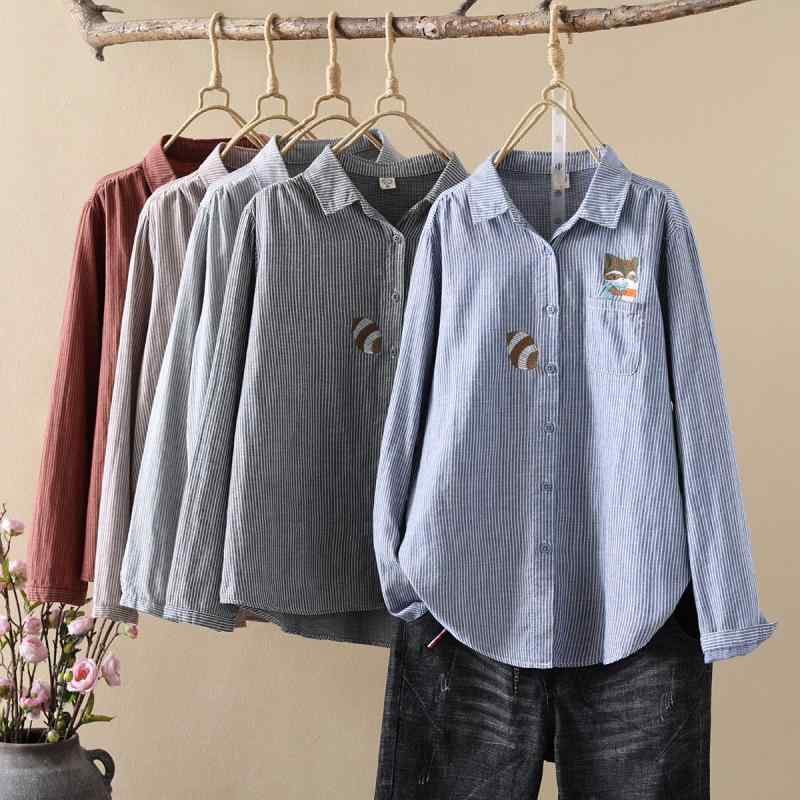 シャツ レディース 長袖 ダブルガーゼ コットン ストライプ 狐 刺繍 ゆったり トップス ブラウス 文芸 清新 かわいい 秋 春夏
