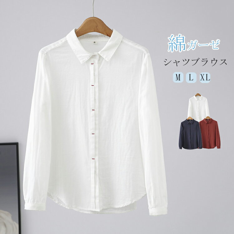 長袖 シャツ 綿 レディース 秋 春 夏 ダブルガーゼシャツ ブラウス トップス 二重ガーゼ 長そで 折襟シャツ コットン 長袖シャツ ラウンドカット ボタン 無地 通勤 カワイイ シンプル オフィス ビジネス 秋新作 春服 ホワイト 白 送料無料