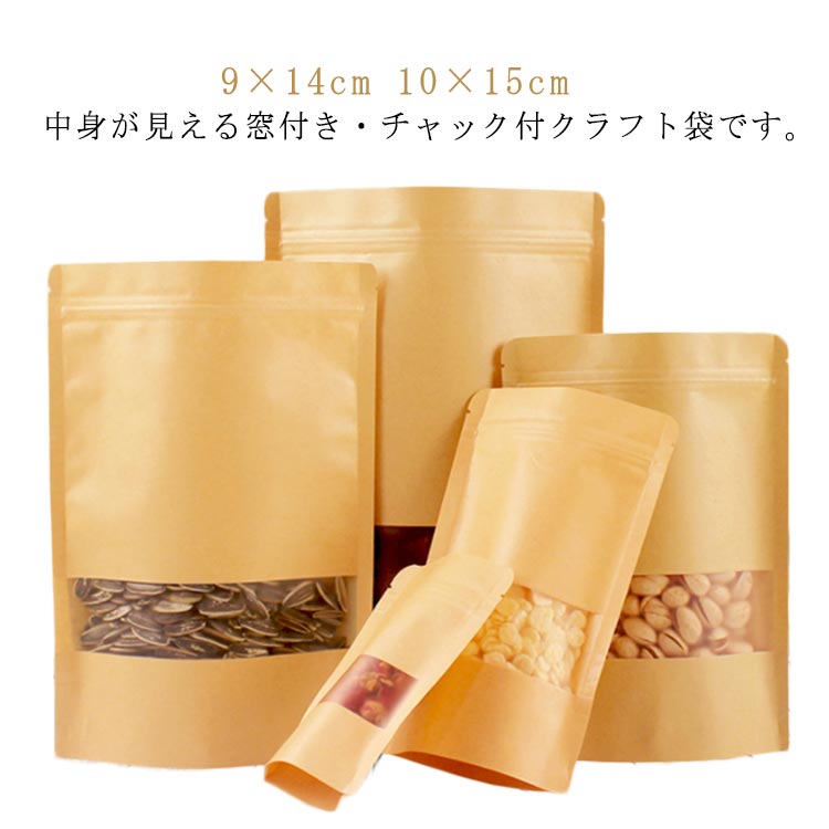 【TIME SALE 10% OFF】クラフト紙袋 窓付き チャック 付き 袋 密閉袋 コーヒー袋 20×30cm 防湿 防水 耐油 お菓子 ジップ袋 自立 ジッパー付き 紙袋 真空 防カビ 防臭 包装 小分け袋 袋 9×14cm 100個入り 保存用 キッチン収納用便利