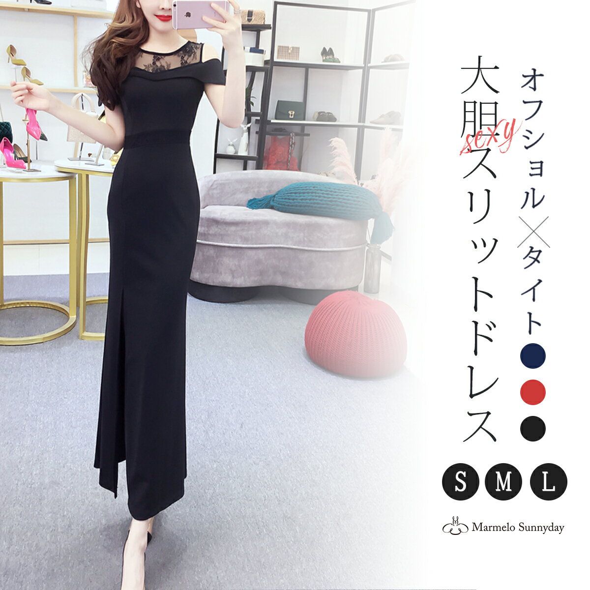 キャバ ドレス ロング 袖あり オフショル 韓国 セクシー スリット 黒 青 赤 レース 大人可愛い パーティードレス 個性的 タイト かっこいい ロングドレス 無地 切り替え バイカラー キャバクラ ドレス 透け感 バックシャン 肩出し 細身 S M L ブラック カジュアル ワンピース