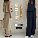 【10/2!クーポンで2,600円】 セットアップ カジュアル アメスリ ワイドパンツ 上下セット レディース ノースリーブ ティアード トップス フリル ウエストゴム 楽ちん パンツ イージーパンツ ゆったり タンクトップ キャミ キャミソール 大人 春夏 春 夏 韓国 cocomomo