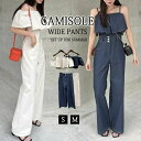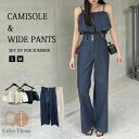 【送料無料】セットアップ レディース カジュアル デニム 夏 2点セット キャミソール ワイドパンツ ハイウエスト ロング丈 韓国ファッション ゆるゆる 可愛い