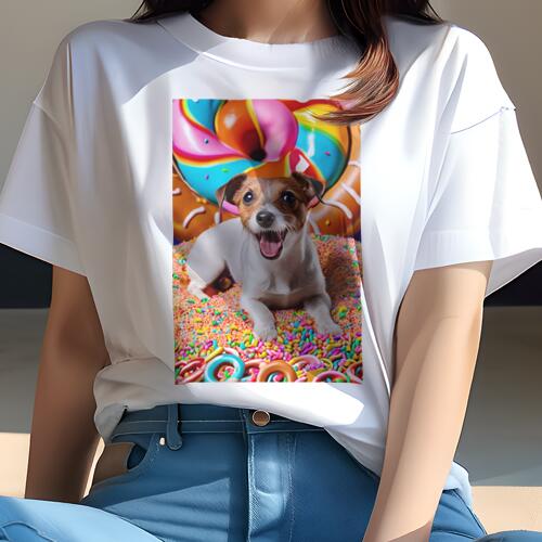 ジャックラッセルテリア Tシャツ レディース 犬ファン 半袖 春夏 犬柄 プリント カジュアル かわいい 人間用 個性派 ここだけのデザイン 面白 ドーナツ ジャックラッセルテリア キャンディ スプリンクル
