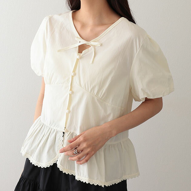 Vネック リボン ペプラム パフスリーブ ブラウス トップス 女性 レディース 夏 サマー 単色 ワンカラー 無地 前ボタン くるみボタン レース使い パフ袖 ぽわん袖 おしゃれ フェミニン 可愛い キュート スイート 甘め おでかけ デート