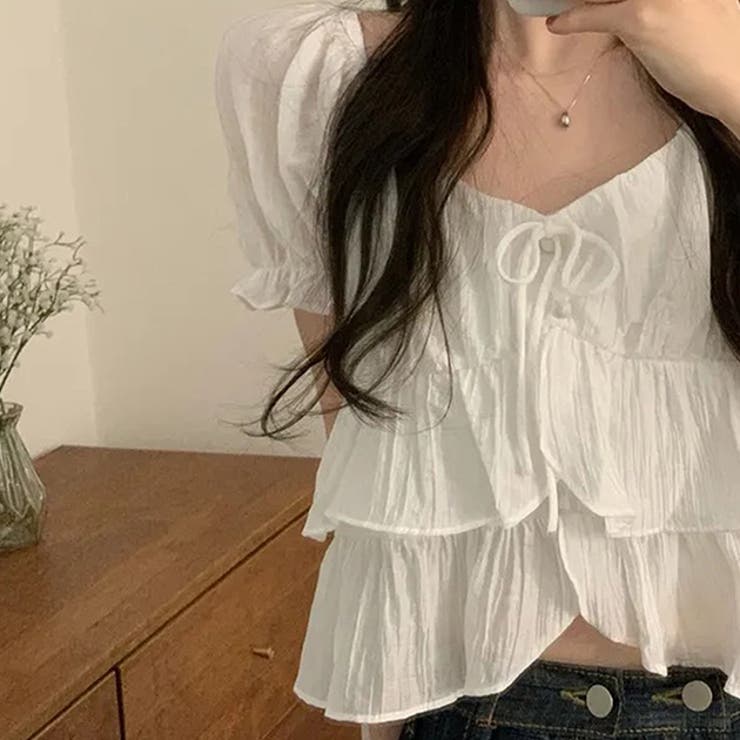 レースレディース ワッシャー加工 ティアード フリル パフスリーブ ブラウス トップス レディース 夏 サマー 単色 無地 ぽわん袖 ショート丈 着丈短め トレンド おしゃれ 抜け感 フェミニン 可愛い ガーリー キュート スイート 大人女子 おでかけ