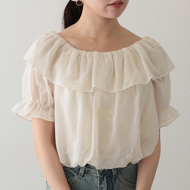 ボタニカル 刺繍 ラッフルカラー 半袖 キャンディースリーブ ブラウス トップス ラウンドネック レディース 女性 夏 ぽわん袖 パフ袖 単色 ワンカラー フェミニン きれいめ ナチュラル かわいい ガーリー キュート スイート おでかけ デート