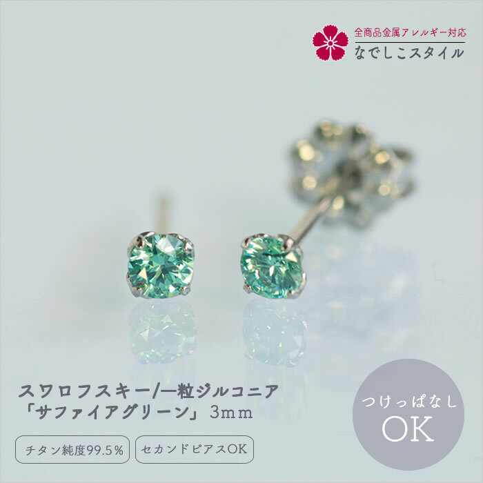 商品情報素材中石:スワロフスキー社製キュービックジルコニア (Puer Brilliance Cut)ピアス金具(ポスト・キャッチ・石留め):ピュアチタン製サイズ中石:約3.0mm×3.0mmポストの長さ:約12.0mmポストの太さ:約0.85mmピアスの重さ(片耳):約0.18g【初夏を思わせるサファイアグリーン】まるで初夏の涼しげな風を思わせるような爽やかな雰囲気のサファイアグリーン。 一滴のブルーを足したような涼し気な色合いが凛として落ち着きのある印象に。 【きらめく上質なスワロフスキージルコニア】ピュアブリリアンスカットされた「スワロフスキージルコニア」は、ダイアモンドの光の屈折率と変わらない上質な輝きを放ちます。 【ちょうどいい3mm】小ぶりながら、さり気なくキラッと輝きます。 目立ち過ぎないちょうどいい大きさが普段使いにぴったり。もちろん、セカンドピアスとしてつけっぱなしも大丈夫です。/p> 【きちんと見せたいお仕事シーンでも】お仕事シーンでは、きちんと見えるスタイルを気にするもの。 透き通った涼しげなサファイアグリーンが、身だしなみに落ち着きのある明るさをプラスしてくれそうです。 【ピアスホールを守るために】お肌に触れる部分は、すべて純チタン99.5%の素材にこだわりました。 純チタンは、アレルギー反応が最もでにくい素材なので、まだピアスホールが完成していないデリケートな時期でも安心してお試ししていただけます。 セカンドピアス時期が終わってもほかのバックキャッチ対応ピアスと組み合わせておしゃれが愉しめます。 【商品名】:スワロフスキー/一粒ジルコニア「サファイアグリーン」3mm セカンドピアス 純チタン つけっぱなしOK アレルギー対応 レディースファッション アクセサリー お出かけ用 キュービックジルコニア ギフト まるで初夏の涼しげな風を思わせるような爽やかな雰囲気の「サファイアグリーン」3mm。セカンドピアスに最適です 9