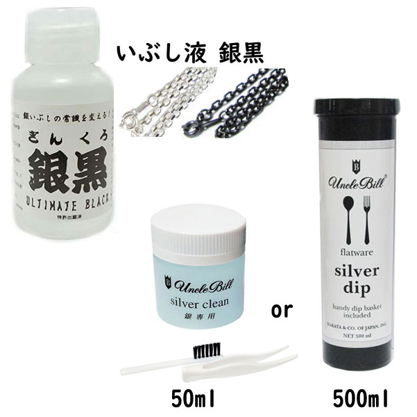 いぶし液はシルバーアクセの”古美の魅力”や”立体感ある仕上げ”の必需品 銀黒とアンクルビル:銀磨きクロス/シルバー洗浄 ●”銀黒” シルバーアクセサリーの「燻し/いぶし液」として欠かせないこの銀黒は、その効果の早さと操作性の全てにおいて大変優れております。 また、その能力はシルバーアクセサリーをプロとして作成する人々やアクセサリー製造企業、シルバークラフトスクールなどでも使用されてることでもその評判は伺えます。 そして、燻し作業の時間短縮、安全性などからもコストパフォーマンスも十分な優れものです。 1本:100ml 説明書付 ●アンクルビル・シルバー・クリーン・キット (シルバー専用洗浄液とジュエリークロスのセット) 硫酸を使用していない酸性の洗浄液。 地荒れをおこしにくく、変色を完璧に取り新品同様の輝が戻ります。 還元作用で変色を取る純銀対応の洗浄液です。 アクアマリン・トパーズ・トルマリン・キュービックジルコニア等の透明な宝石とペリドットやムーンストーン等の半透明な石も磨けます。洗浄液は繰返し使えます。 ※汚れが取れにくくなったら買い替え時です。 広口のボトルの中には、カゴがついているので、 洗浄液に浸けたあとも取り出し簡単。 ジュエリークロスは、ゴールド・シルバー・プラチナなどにお使いいただけます。 ※柔らかすぎる24金プルーフや、メッキの厚みが薄い製品にはご使用できません。 (1)【シルバークリーン】洗浄液207ml (2)ジュエリークロス(18x28cm) (3)ブラシ(小) (セット内の【シルバークリーン】は石付きシルバーアクセに役立つ一覧表に対応品。 ※沖縄・離島へは液体物が宅配便で取り扱いできないため、 宅配便をご選択いただきましても郵便扱いにて発送となりますので予めご了承ください。【06XY・ゼロキシー】最強のオリジナルセットを、色々な組み合わせで販売致しております。 ●シルバーアクセ サリー 、その 他宝石磨きのお手入れ用品ブランド ハガティ社が銀磨きを発明して以来、 銀磨き製品、宝石 磨き製 品の中で “世界トップシェア”を誇るに あたり、並々ならぬ努力を重ねた、ハガティ社の3代目会長:故ビル・ハガティ の心である【品質・性能・利便性】や、 【ものづくりの精神】を忠実に引継ぐ決意を心に、【アンクルビル】と命名し新たなブランド展開が、この日本か らスタート。 ●ハガ ティ社3代目会長:ビル・ハガティ = アンクル ビル (ビル おじさん)の 想い。 「信頼できる品 質と性能のケア商品を、一生懸命作れば必ずやその熱意と背負う正直さがお客様 に通じる。 ※高品質であることを常に追い求 めている【アンクルビル】は、ジュエ リー製造のプロの現場だけではなく、造幣局などでも使用されていることから、 その品質の良さが伺えま す。 登録商標 【アンクルビル / Uncle Bill】 ◎こちらも、「銀を燻すなら、これしかない」と絶賛するプロが続出の 銀を黒く燻す、イブシの名人“銀黒・ぎんくろ”