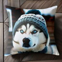ニット帽 シベリアンハスキー 冬 クッションカバー 45×45cm アニマル柄 おしゃれ 可愛い クッション本体付き 正方形 犬ファン