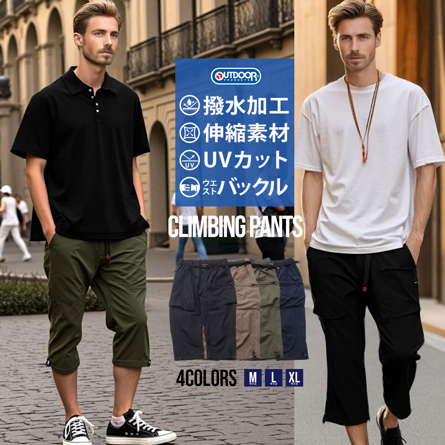 OUTDOOR クロップドパンツ メンズ おしゃれ 撥水 ストレッチ 伸縮性 ハーフパンツ 短パン ショートパンツ 7分丈 七分丈 クライミングパンツ パンツ UVカット 無地 シンプル M L XL アウトドア 父の日 20代 30代 40代 ユニセックス 男性 男 服 春 夏 夏服 春夏 ファッション