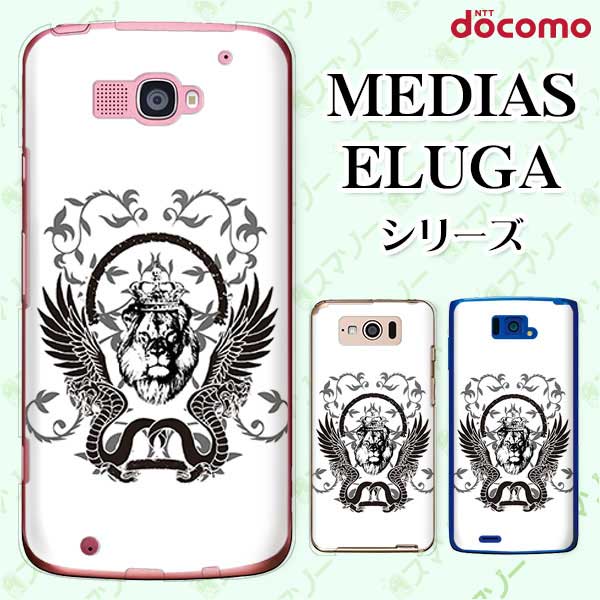 docomo ケース 【MEDIAS X N-06E/ N-04E/ N-07D/ NE-202 (wi-fi ほぼスマホ対応)/ U N-02E/ ELUGA P P-03E/ X P-02E/ V P-06D/ power P-07D】 ライオン クラウン 王冠 白黒 オサレ ハード メディアス エルーガ スマホケース