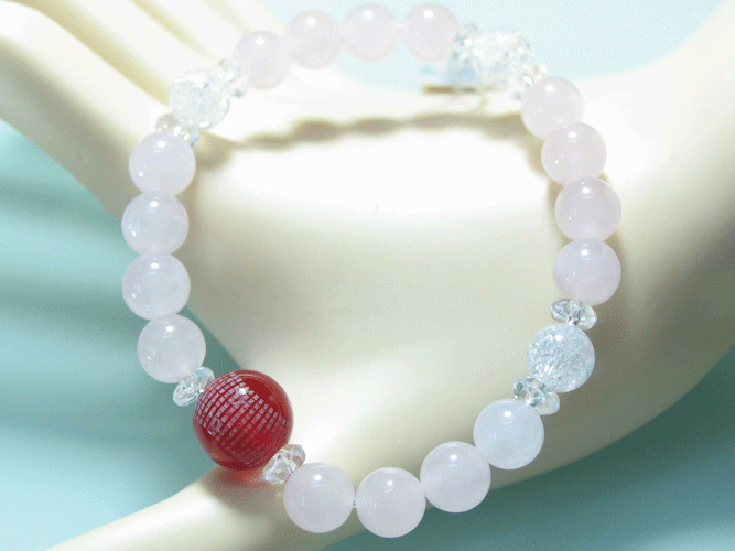 オニキス・ローズクォーツ・水晶・クラッククオーツを使用した 女性に人気のパワーストーン数珠ブレスレットです。 オニキスとローズクォーツをメインに、クリスタル(水晶)、クラッククォーツ(水晶) を使った贅沢な数珠タイプレスレットです。 人気アーティスト、Gackt(ガクト)氏もが着用しているこれらブレスレットの 女性版デザインとして作りました。 ちなもにガクト氏は、大粒のオニキスをメインにした数珠ブレスを 身につけるようになってから、数々の成功を手に入れてきました。 単なるビジュアル系バンドのボーカリストから、NHKの主役級の役を演じるまでに なり、幅広い人気決まり、めきめきと運勢が上がっていったそうです。 まさに、奇跡を呼ぶパワーストーンとも言えるかもしれません。 それぞれの石には、こんなパワーがあるとして信奉されています。 オニキス:漆黒の美しい珠のみを使用しています。 ・・・潜在能力を引き出し、無限の可能性を開き、運勢を好転させる。 ローズクォーツ(紅水晶):愛されカラーのピンクが可愛いパワーストーン。 ・・・恋愛運・恋人運・出会い運をもたらす。 水晶(クリスタル):天然のブラジル産のものを使用しています。 ・・・最も強力なヒーリング作用を持つ、万能のパワーストーン。 クラッククオーツ(爆烈水晶):特殊加工した天然水晶です。 ・・・夢を実現させるパワーストーン。 【材質】ブラックオニキス(珠径:約8mm)、ローズクォーツ(紅水晶)(珠径:約10mm、8mm)、 クラッククオーツ(獏烈水晶)(珠径:8mm)、水晶(珠径:約8mm) 【重さ】約16g ※商品画像について モニターの発色の具合によっては、実際のものと色が異なる場合があります。 ご了承をお願いいたします。男女兼用版は10mmこちら→10mm オニキス・アクアオーラ・ブレスレット〔アメジスト入り〕 男女兼用版は8mmこちら→8mm オニキス・アクアオーラ・ブレスレット〔アメジスト入り〕
