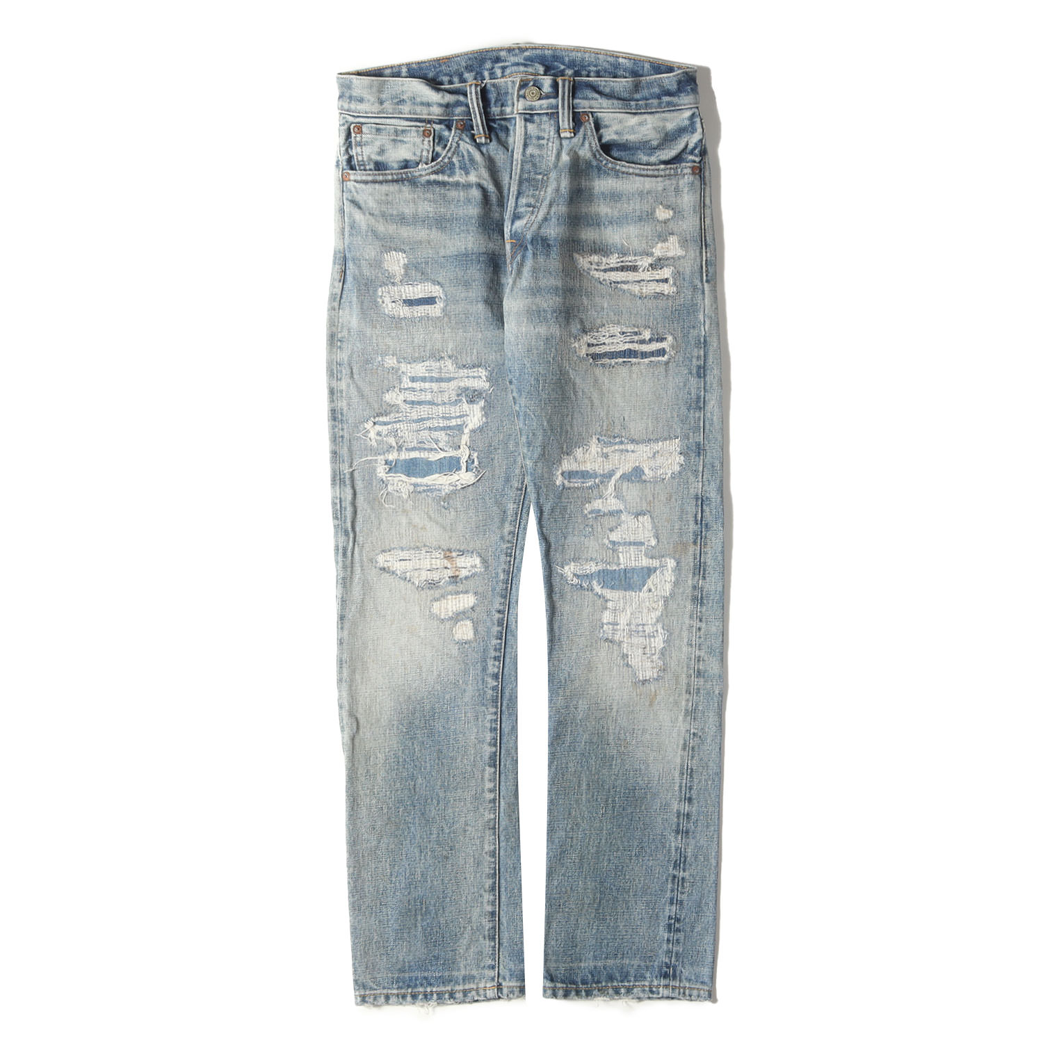 BLUEWAY:13.5ozビンテージデニム・ストレートジーンズ(クラッシュリペア):M1927-7754 28-36 ブルーウェイ ダメージジーンズ メンズ デニム 裾上げ ストレート 日本製