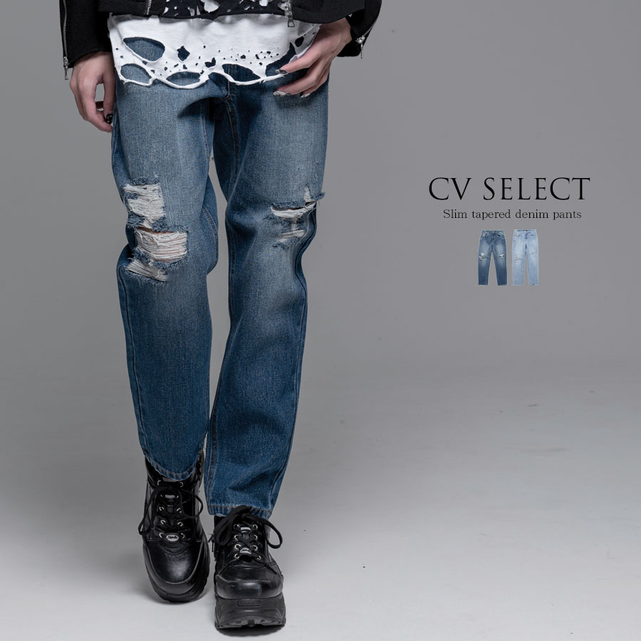 "CV Select【シーブイセレクト】ダメージ加工ストレッチスキニーデニムパンツ/全2色" デニムパンツ メンズ ブランド V系 地雷系 メンヘラ 服 ファッション サブカル系 ユニセックス 病み おしゃれ 大人 ダメージ クラッシュ リペア 伸縮 ジーンズ ジーパン 細身 スリム