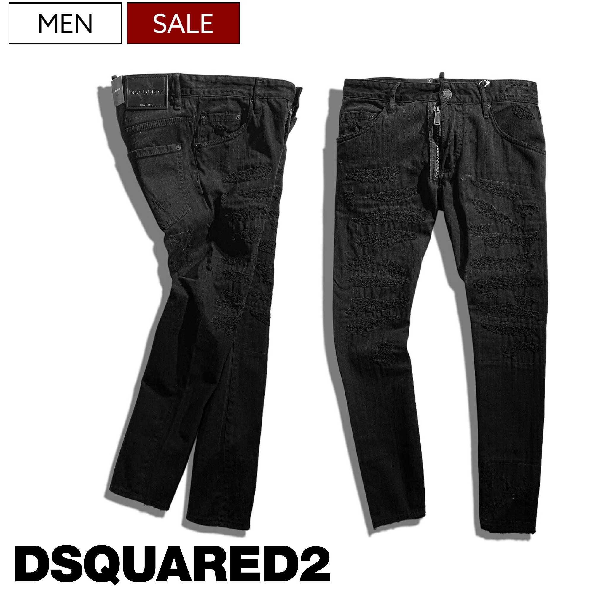 【定価92,400円(税込)】DSQUARED2 ディースクエアード 職人技が随所に光るクラッシュ&リペア加工と都会的なシルエット!ビッグジップデザインが目を惹くテーパードブラックZIPデニムパンツ《SKATER JEAN -スケータージーン-》 ストレッチ ブラック S74LB1123 メンズ