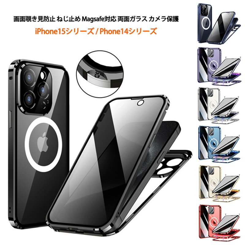 画面覗き見防止 マグネットねじ止め式 Magsafe対応 両面ガラス iPhone15 15Plus 15Pro 15ProMax iPhone14 14Plus 14Pro 14ProMax ケース 全面保護 両面 9H強化ガラス カバー アルミバンパー アイフォン15 15プロ アイフォン14 メタルバンパー 背面クリアケース フルカバー