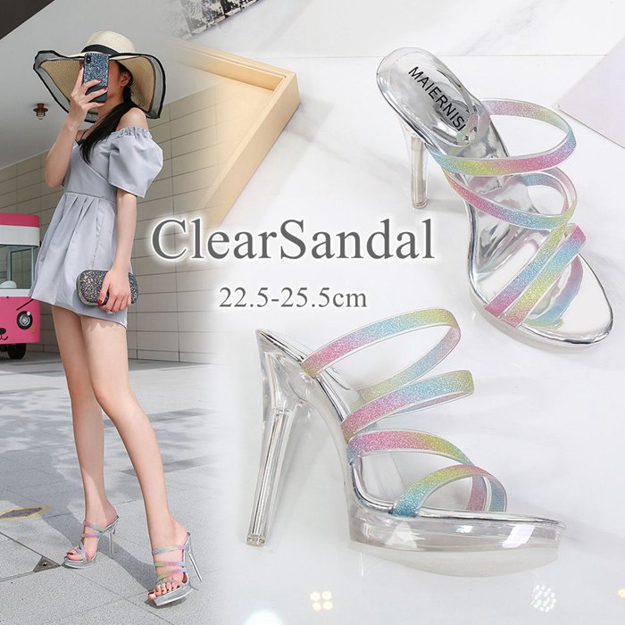 送料無料 厚底サンダル クリアサンダル クリアヒール ハイヒール レディース キャバ 夏コスプレ ヒール高12cm 大きいサイズ/美脚セクシーハイヒール インポート脚長効果 定番クリアー 前厚トゥ/クリアソール キラキラサンダル/ゴージャスエレガント
