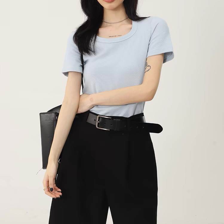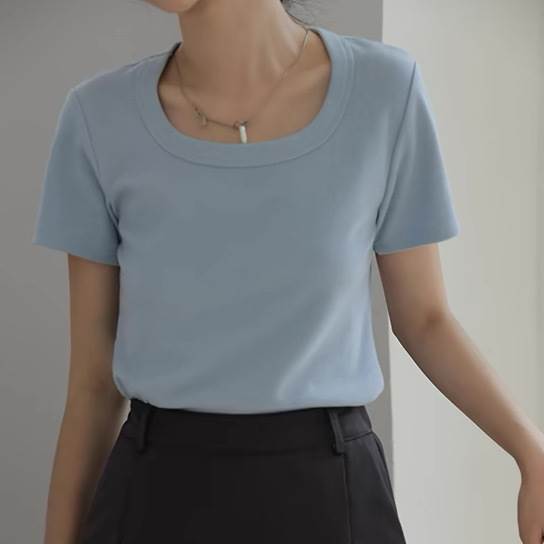 Tシャツ カットソー ブラウス トップス 半袖 Uネック スリム 伸縮性 爽やか レディース かわいい 大人可愛い きれいめ こなれ感 シンプル カジュアル 主役級 存在感 個性的 韓国 オルチャン デート お出かけ Tシャツ プルオーバー ストレート ラフ ショート丈
