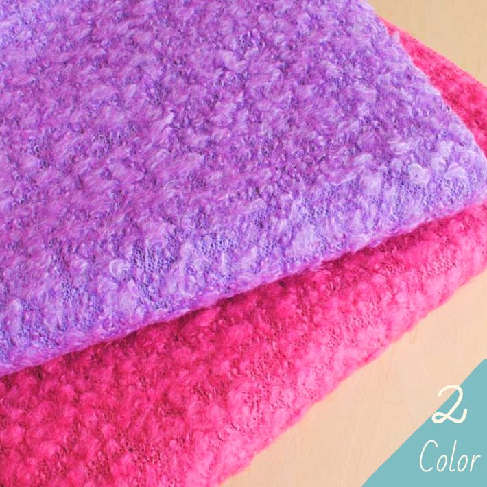 タグ: ピンク 紫565ウール混ループニット 切り売り=1m単位 全2色 【メール便不可】 商品説明特 徴 クルっと丸まったループ状の輪奈が特徴的なブークレニット。(中国製) ローゲージの平編みジャージの表面にループヤーンを使用することで、ラフでこなれ感のある仕上がりに。 毛房の密度の違いで透け感もまばらにできるので、インナーとのレイヤードも楽しめます。 用途はカットソー・セーター・ボレロ・カーディガン・チュニック・ストール・パーカー。 ニットバッグ・カバーなど小物やインテリアにも。 カラフルな色使いでおとなしくなりがちな秋冬ファッションのアクセントに。 ※ボタンの大きさ=2cm ▲CAUTION▲ボア・ファー生地の取り扱いについて 生地の特性上、カット面付近の毛房は抜け落ちます。 裁断は毛並みの方向に気を付けてカットしてください。 また裁断時には毛ボコリが発生します、あらかじめご了承ください。 規 格 生地幅:148cm長さ:1m単位でのカット(10cm単位は不可) ※カートに入れていただいた数量分をつながった状態でカットいたします。(例:数量2 = 2mでカット) 素 材 アクリル82%、ウール15%、ポリエステル3%厚 み薄い ☆☆☆☆★ 厚い 1.25mm〜1.53mm 見た目より厚手 透け感透ける ☆★☆☆☆ 透けない ループの密度はまばら、透け感を活かして やわらかさかたい ☆☆★☆☆ やわらかい 毛房は少しチクチク感あり 伸縮性伸びない ☆☆☆★☆ 伸びる タテ・ヨコともに少し伸びる程度 シワ・折り目つきやすい ☆☆☆☆★ つきにくい つきにくい(アイロン厳禁)縫いやすさ縫いにくい ☆☆☆★☆ 縫いやすい ニット用の針で 色合い (近似色ミシン糸) 【11マゼンタピンク】赤みのマゼンタ ┗(#60シャッペスパン 9番色) 【12.バイオレット】少し青みの紫 ┗(#60シャッペスパン 245番色) 注意点 この商品は当店実店舗および複数の通販サイトでも販売しております。 在庫数の更新は随時行っておりますが、お買い上げいただいた商品が、品切れになってしまうこともございます。 その場合、お客様には必ず連絡をいたしますが、万が一入荷予定がない場合は、キャンセルさせていただく場合もございますことをあらかじめご了承ください。 ※画面上と実物とでは多少色が異なって見えることがありますのでご了承ください。 在庫限りだからできるこの価格!! 1m単位でカットいたします、 10cm単位ではカットできませんのでご了承ください。 ※ご注文例 1mの場合は⇒ 「1」 2mの場合は⇒ 「2」 と必要な長さの分だけ入力してください。