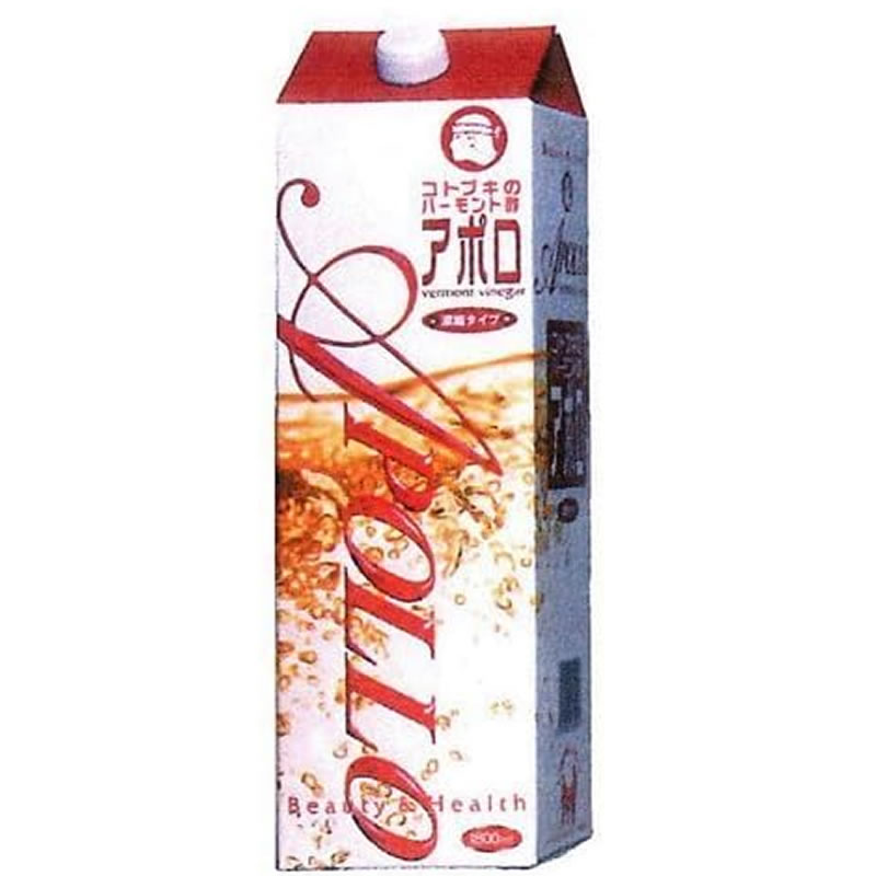 コトブキ バーモント酢アポロ バーモント酢アポロは、輝く太陽と豊かな大地が育んだリンゴと米を丹念に醸造したリンゴ酢・米酢に、 健康維持食品として広く親しまれているクレロラ、ニンニク、ローヤルゼリー、 高麗人参などのエキスをブレンドした健康美容飲料です。 リンゴの爽やかな風味に仕上げていますので、毎日美味しくお召し上がりいただけます。 健康で美しく、充実した生活のため、バーモント酢アポロをご家族皆様でご利用ください。 (1) 1回の飲む量は約20mlの濃縮タイプです。 1800mlで90杯分もお飲みいただけますので大変に経済的です。 (2) 20mlを10倍希釈した1杯分のカロリーは約24キロカロリー。 カロリーが気になる方にも安心してお飲みいただけます。 また、甘味料は天然素材のステビアを使用していますので、健康に気を使われる方にもお薦めです。 (3) 合成保存料・合成着色料・合成甘味料は一切使用しておりません。 商品情報 名称 バーモント酢アポロ 原材料名 高果糖液糖、醸造酢(りんご酢、米酢)、ハチミツ、リンゴ濃縮果汁、還元水飴、高麗人参エキス、クロレラエキス、ニンニクエキス、海藻エキス、ローヤルゼリー、酸味料、香料、グリシン、甘味料(ステビア)、ビタミンC、貝殻焼成カルシウム、ビタミンB2、ビタミンB6 内容量 1800ml 賞味期限 製造日より720日(未開封) 保存方法 高温多湿を避け、冷暗所にて保存してください。 発売元 株式会社コトブキ -作り方- ● 濃縮タイプですので水またはお湯などで5〜10倍に薄めてお飲みください。 ● 牛乳で割りますとヨーグルト風ドリンクになります。 ● お好みによってお湯割り焼酎割などもお楽しみいただけます。 ● お料理の隠し味としてもご利用いただけます。 ● スポーツ選手やフィットネスクラブにスポーツ飲料として、 また、お風呂上りの水分補給として人気です。