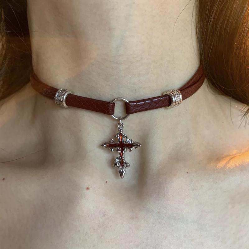 ゴシック調 レザー シンプル 短め カジュアル チョーカー アクセサリー レディース Tangluo ホット ガール スタイル ワイン レッドレザー クロスチョーカー カラー 鎖骨 チェーン ホワイト ネックレス サブカルチャー