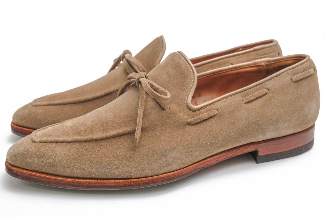 BRANDINGの全商品で利用可↓↓1%OFFクーポン↓↓CROCKETT&JONES クロケット&ジョーンズ タッセルローファー メンズ WENDOVER 牛革商品説明クロケット&ジョーンズ(Crockett & Jones)は、イギリスのノーザンプトンで、1879年、ジェームズ・クロケットと義理兄弟のチャールズ・ジョーンズが創業。イギリスのノーサンプトンはチャーチ、トリッカーズなど、多くの伝統ある靴のブランドが多く拠点を置く地域だが、その中でもクロケット&ジョーンズは最大級の規模を誇るブランド。大きな工場を持ち、世界中で最も多くの木型の種類を持つ靴メーカーとして知られ、デザインバリエーションや素材選びなど多くの選択肢をもっている。また生産ラインを、合理的かつ効率的に組み立てているため、エドワードグリーンなど、他の老舗ブランドより価格がやや低くなっている。価格帯とバリエーションの豊富さ、丈夫さから、ビスポーク系の靴の入門的なブランドとしても親しまれている。クロケット&ジョーンズの隠れた名品で、シューレース付きのスリッポンローファー。丸みのあるエッグトゥが特徴で、程よい細身なシルエット。スエード素材なのでフォーマルになりすぎず、ドレスパンツやデニムにも合わせやすいのが嬉しいポイント。商品詳細◆ブランド名 CROCKETT&JONES◆サイズ表記 UK9◆日本サイズ参考 約27.5-28.0cm◆サイズ詳細 アウトソール靴底全長 約31.5cm、アウトソール靴底幅 約10.5cm、ヒール高さ約2.5cm◆仕様 ワイズE◆特徴 スリッポン レザーソール グッドイヤーウェルト製法◆型番 WENDOVER◆生産国 イギリス◆素材 上質な革 スエードレザー◆素材詳細 牛革◆色 ベージュ◆商品状態 中古品-良い◆状態詳細 ハーフソール、ヒール修理済み◆付属品 簡易シューキーパー