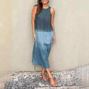 ワンピース レディース 春夏 カジュアル エレガント 綿麻混 ノースリーブ ラウンドネック Aライン ゆったり ミディ丈 サイドスリット グラデーションカラー プリント