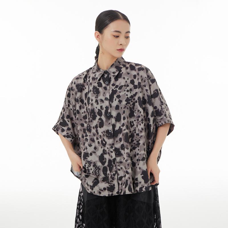 シャツ ブラウス レディース アニマル柄 半袖 ゆったり ドレープ感 ポリエステル 細見え トップス 着回し 春夏 グラデーションカラー プリント 襟付き グリーン カーキ