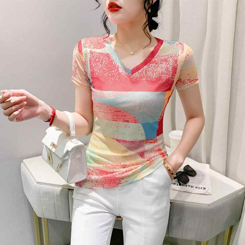 Tシャツ レディース 春夏 メッシュ素材 Vネック 半袖 スリムフィット プルオーバー グラデーションカラー プリント 通勤 オフィス カジュアル きれいめ トップス