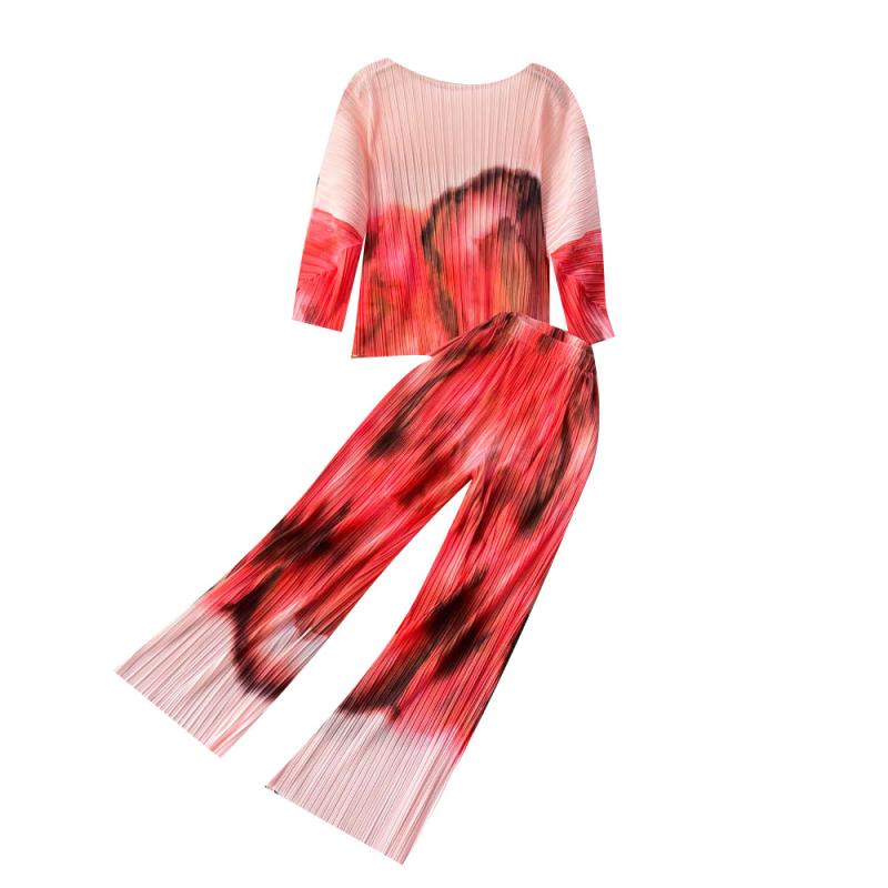カジュアルセットアップ レディース 春夏 ゆったり グラデーションカラー プリント ラウンドネック プルオーバー 長袖 トップス ストレートワイドパンツ 2点セット