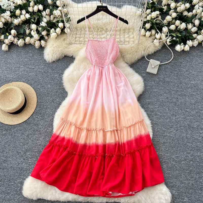 ワンピース レディース ロング丈 キャミソール バックオープン グラデーションカラー プリント ウエストマーク 細見え 上品 エレガント 欧米風 リゾートスタイル ノースリーブ ハイウエスト 切り替え 春夏(x2)