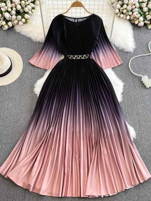 ワンピース レディース 上品 エレガント 大人可愛い 五分袖 ラウンドネック ウエストマーク ハイウエスト 体型カバー Aライン フレア グラデーションカラー プリント プリーツ ロング丈