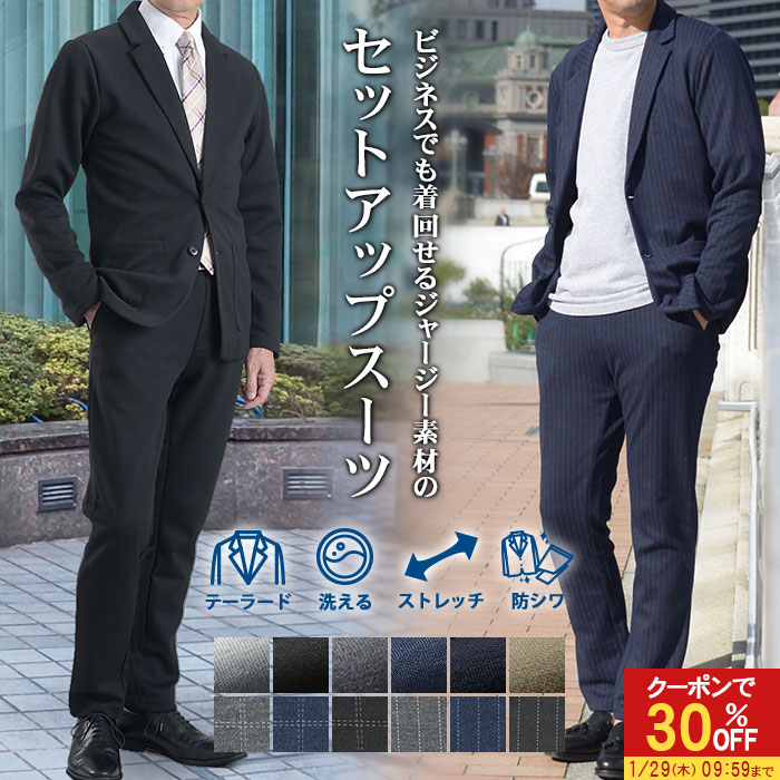 【30%OFFで4,830円】 メンズスーツ セットアップ 裾上げ済 ビジネス テーラードジャケット ストレッチ 伸縮 メンズ カジュアルスーツ ポンチ素材 スウェット パンツ ジャージ 無地 チェック ストライプ ブラック ネイビー チャコール グレー ベージュ M L LL 3L