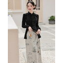 チャイナドレス レディース 新中国風 レトロ 若者向け エレガント 個性的 ブラックトップス グレーロングスカート ベルベット 高級感 スリム ツーピース セット ロング丈 立襟 長袖 チャイナボタン 微弾 ポリエステル