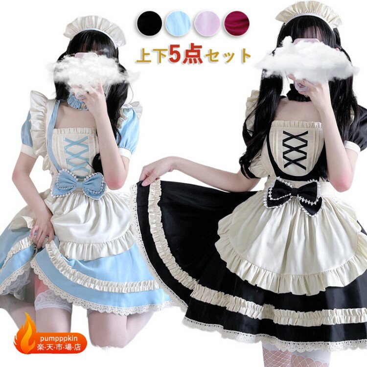 大人メイド服コスプレ衣装可愛いロリータワンピースレースフリルハロウィンコスプレレディースゴスロリワンピース蝶リボン半袖制服仮装上下5点セットアップイベント学園祭メイドコスチューム仮装萌えコスプレ衣装ブラックブルーレッドブルーSML