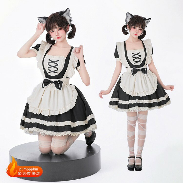 メイド仮装大人コスプレ衣装可愛いメイド服ロリータワンピースレースフリルハロウィンコスプレレディースゴスロリ蝶リボン半袖制服仮装上下5点セットアップ猫耳追加可イベント学園祭メイドコスチューム仮装萌えコスプレ衣装ブラック黒SML